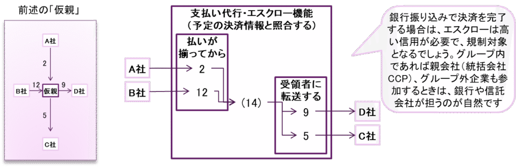 - 下図のように、決済尻の送金は、payment だけですが、毎月末などの時点決済であれば、最終の支払いと受領は事前に分かっており、これを予定し、決済が完了することを管理するという意味で、エスクロー機能です