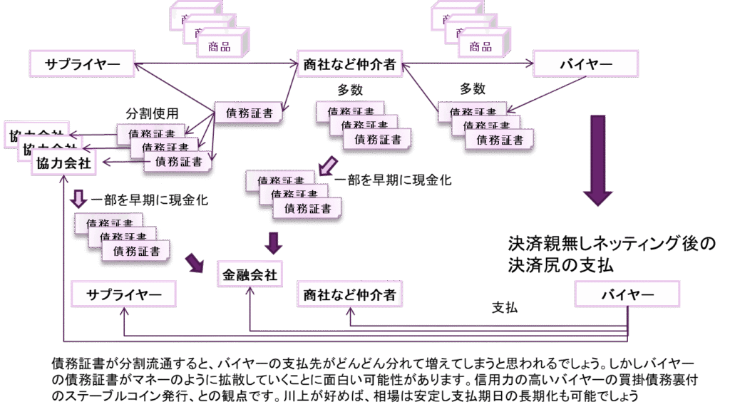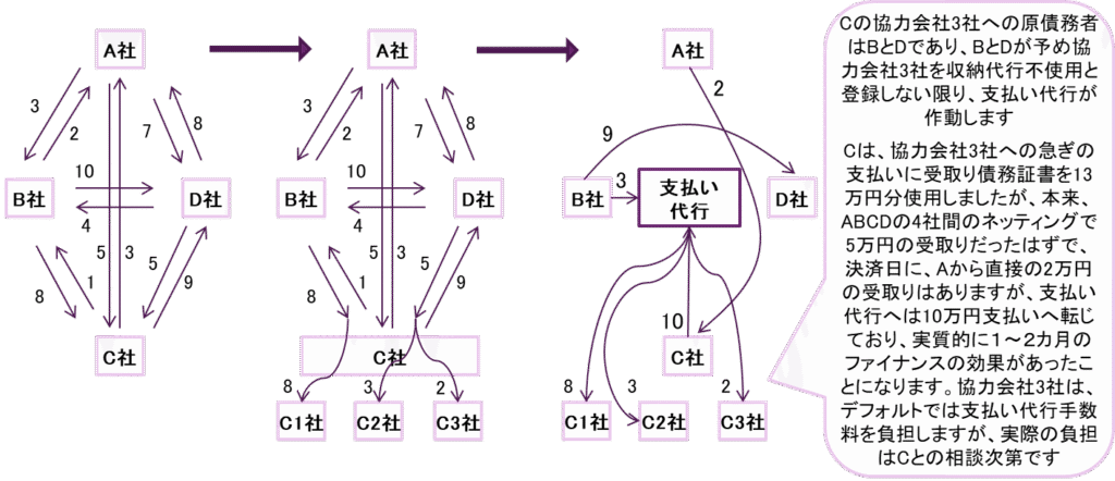 下図のように、C社が協力会社のC1, C2, C3社に債務があったとして、B社やD社から受け取った債務証書を、手形の流通のように、三つの協力会社への支払いに使うと、どうなるでしょうか