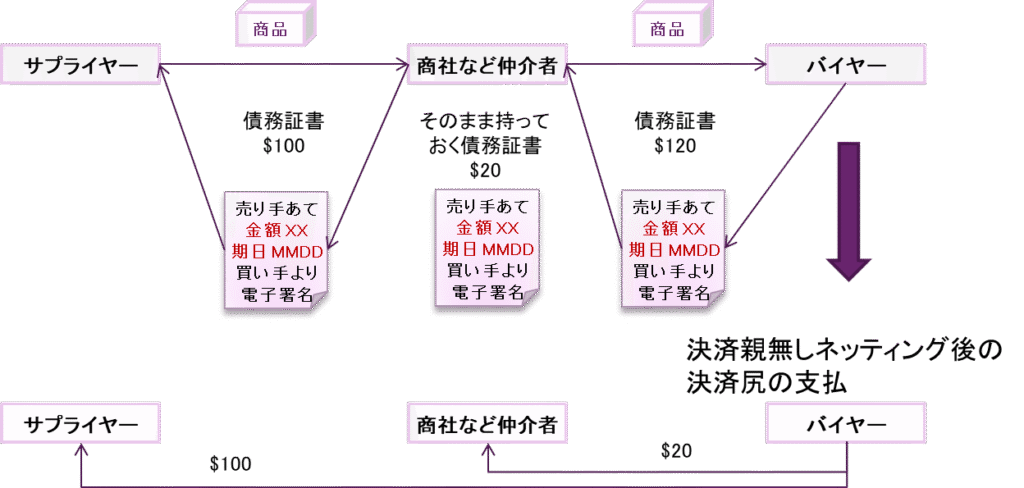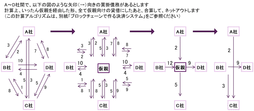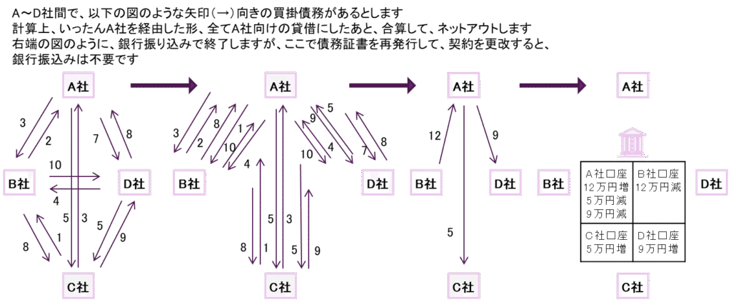 まず、基本形として、手形交換所や清算機関のような機構が必要なく、最終決済尻に対して、最小限の銀行送金で支払いが完了することを図示します。決済尻を送金せずに、再度、債務証書を発行して、期日付きの企業間債務・債権として、支払いを猶予することもシステム化できます