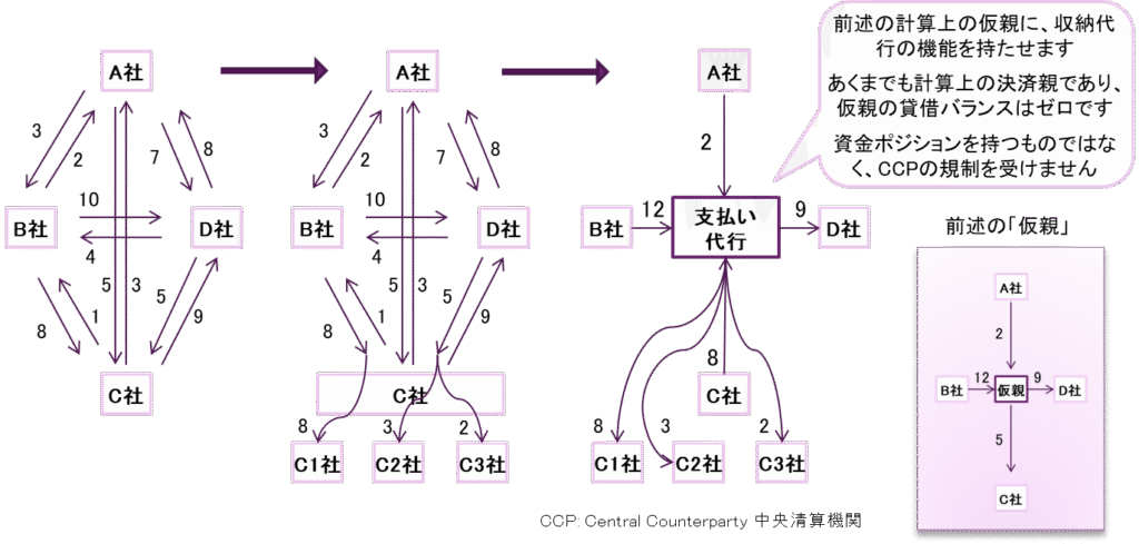中央の清算機関(決済親)が不要な一つの応用形として、決済日にネッティンググループの中の1社が臨時で決済親になるという仕組みです