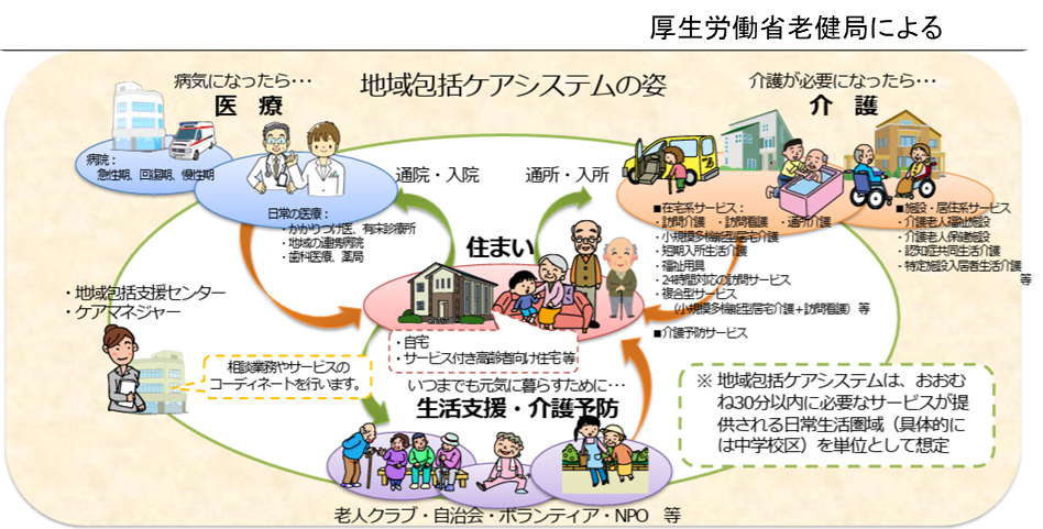 厚労省や自治体は、高齢化による介護ケアの需要が増大すると予測し、「地域包括ケアシステム」の構築を政策として掲げています