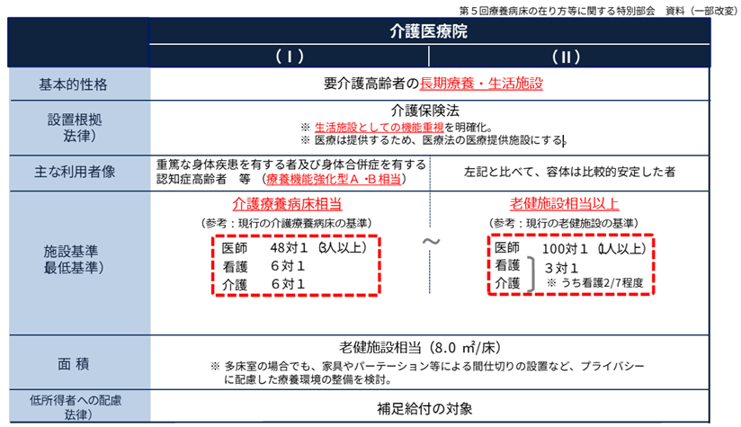 - より重篤な高齢者を対象とする、Ⅰ型、容体が安定した対象者向けのⅡ型、それぞれ施設基準(スタッフの配置基準)は以下の通り、Ⅰ型では看護、介護別々に6対1と決められています。Ⅱ型は老健程度です