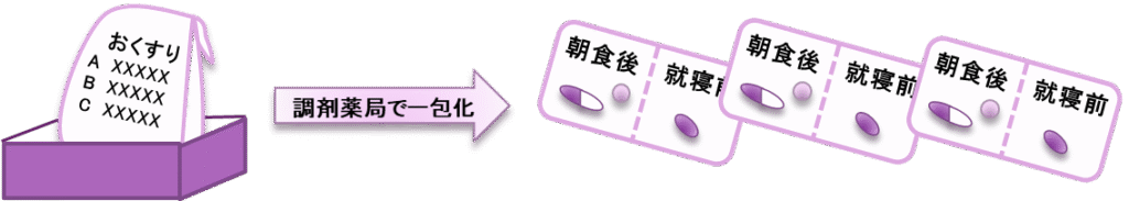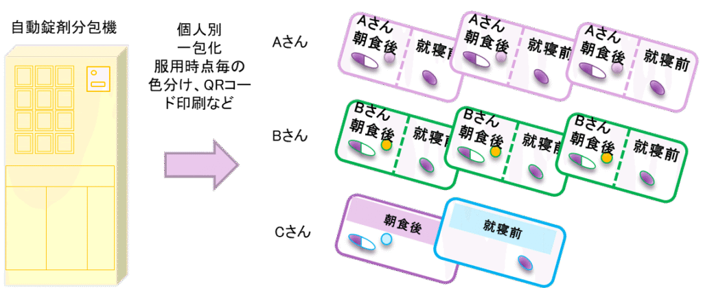 ちなみに、医療機関の入院病棟では、医師の処方オーダーに基づく医薬品の配薬準備として、薬剤師と看護師の連携で、必要があれば一包化され、その後、大きなピルケースである「配薬カート」に患者ごと、服薬日時ごとに区分整理します。介護施設に対しても、調剤薬局によって異なりますが、病棟と同じような対応ができるところがあるようです
