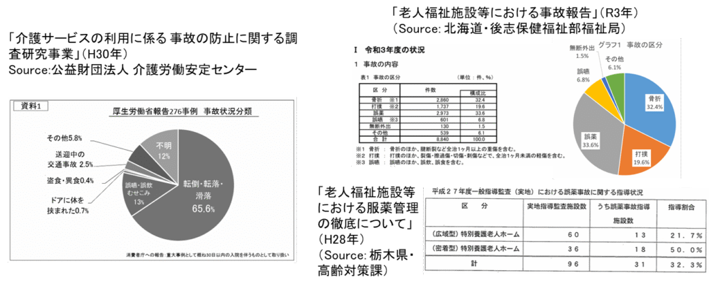 高齢者介護施設における事故報告には、いくつかの異なる調査方法があり、自治体ごと、行政ごとに異なる分類で取りまとめられています。シリアスな事故、事故後に入院するケースなどに焦点を当てた調査では、転倒の比率が圧倒的に多くなります