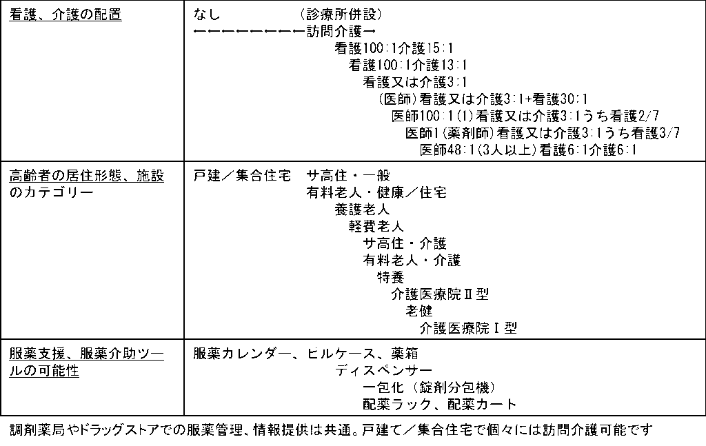 ここでは、服薬管理と服薬支援の観点に絞って、こうした高齢者の居住する住宅、施設をみています