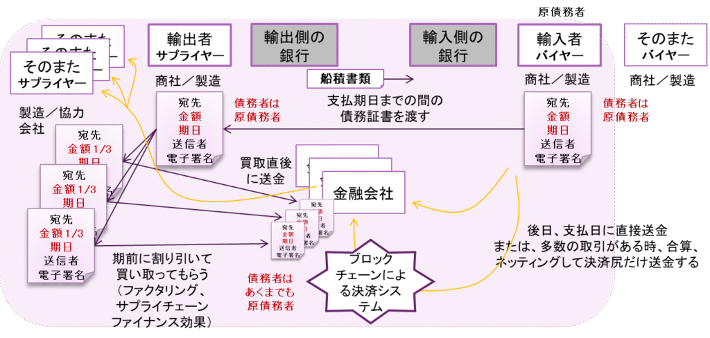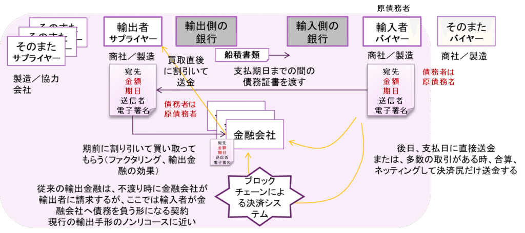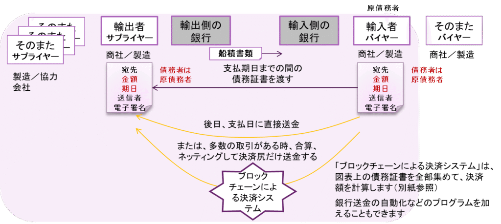 このコンテンツでは、貿易取引、貿易決済、貿易金融におけるブロックチェーン債務証書の発行、債務流動化、また、基本的なファイナンシングの仕組みについて、ブロックチェーン決済システム(別紙参照)の利用も含めて、書き起こしてみました