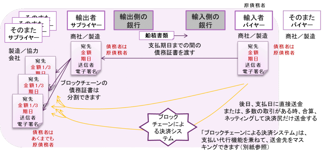 右側の輸入者が買掛債務を立てるとき、その債務証書をブロックチェーン上で発行して、売掛側に渡します