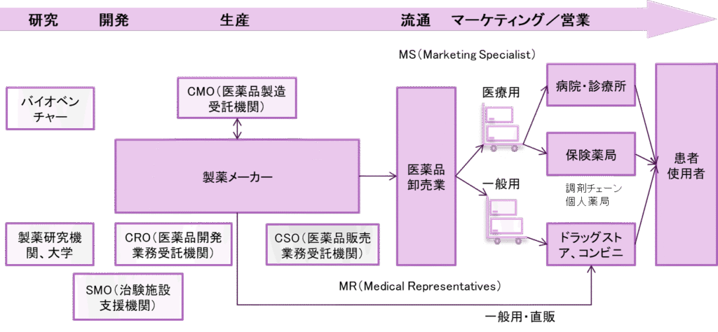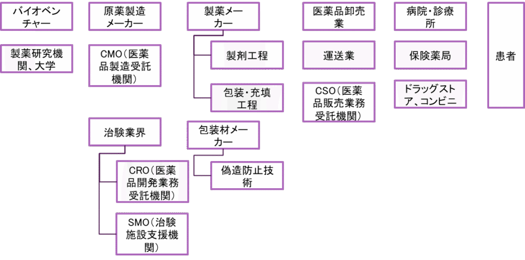 医薬品の商品としての流れを、サプライチェーン上で簡単にまとめると、以下のようになります