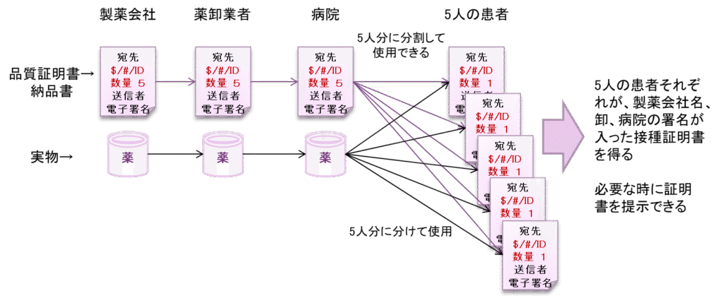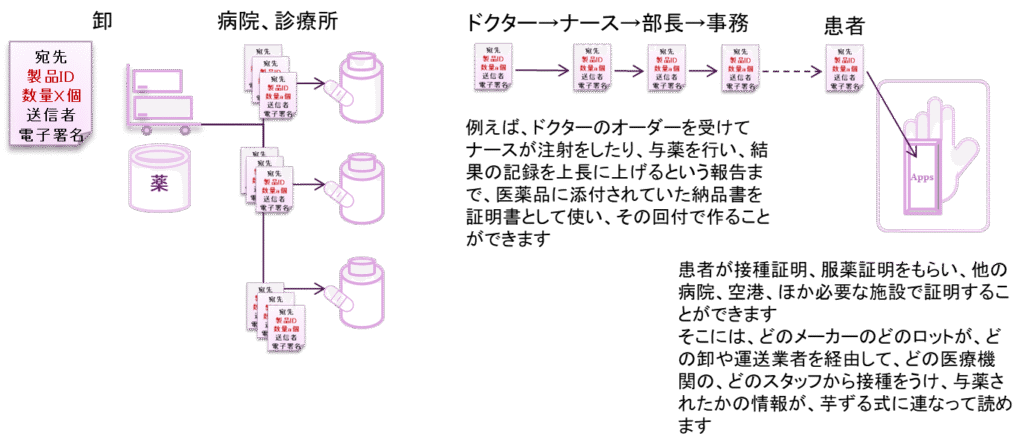 たとえば、服用ないしは注射したことの証明書を出したい薬やワクチンに対して、製薬会社の納品書(品質証明書)からはじまり、病院における接種証明まで、芋ずる式に元のドキュメントに署名を連ねていく仕組みが作れます