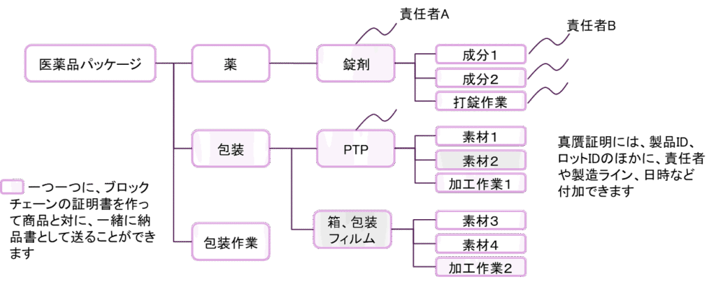 偽造防止を考えるとき、薬品だけでなく、包装も含めた製品構成、製造業で言うと部品表(BOM)のような全てのパーツを個別に証明できるとよいでしょう