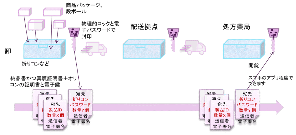 ブロックチェーンの活用としては、以下の図のように、折りコンなどを物理的に電子鍵で封印し、その電子鍵情報をブロックチェーンの証明書の中に埋め込み、納品書として最終の処方薬局に送り、そこで初めて開錠して箱を開けられるという仕組みが作れます