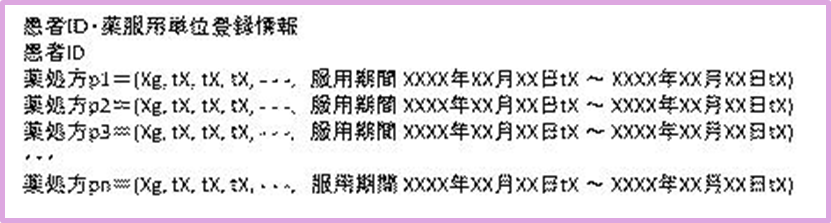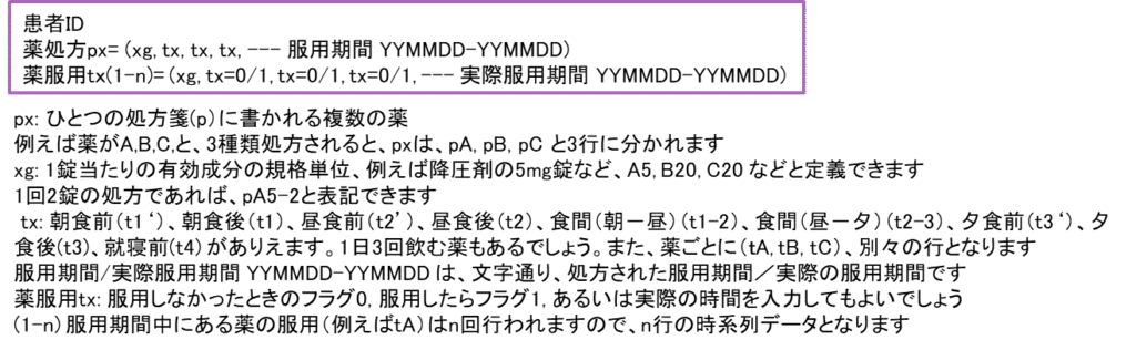 服用データの記録やハンドリングを実際のシステムに実装するときは、こうした規格に準拠することが重要ですが、ここでは、説明と理解のため、簡素化して以下のように簡単なデータ・フォーマットを想定します