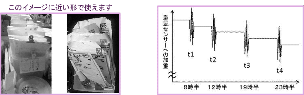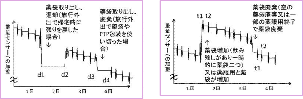 - 薬袋の次の処方があって一時的に薬袋が二つ、ダブるとき、OTC薬品やサプリも、瓶が一時的に二つになる時も、その大きな重量変動を認識し、空になったものを廃棄するときも、同じく大きな重量変動として認識します