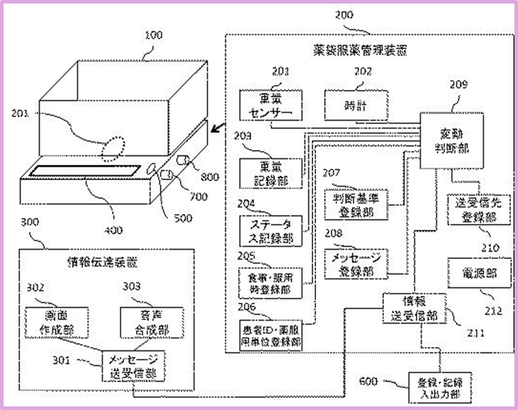 【解決手段】 薬袋服用管理装置200は、重量センサー201による薬箱の重量変動と時計202によるタイムスタンプを受信する変動判断部209と、食事・服用時登録部205と、患者ID・薬服用単位登録部206と、判断基準登録部207に基づき薬の飲み忘れ又は一部飲み忘れがあるか否かを判断し、薬の飲み忘れ又は一部飲み忘れがあると判断された場合にそのメッセージを患者に伝達する情報伝達装置300を備える。